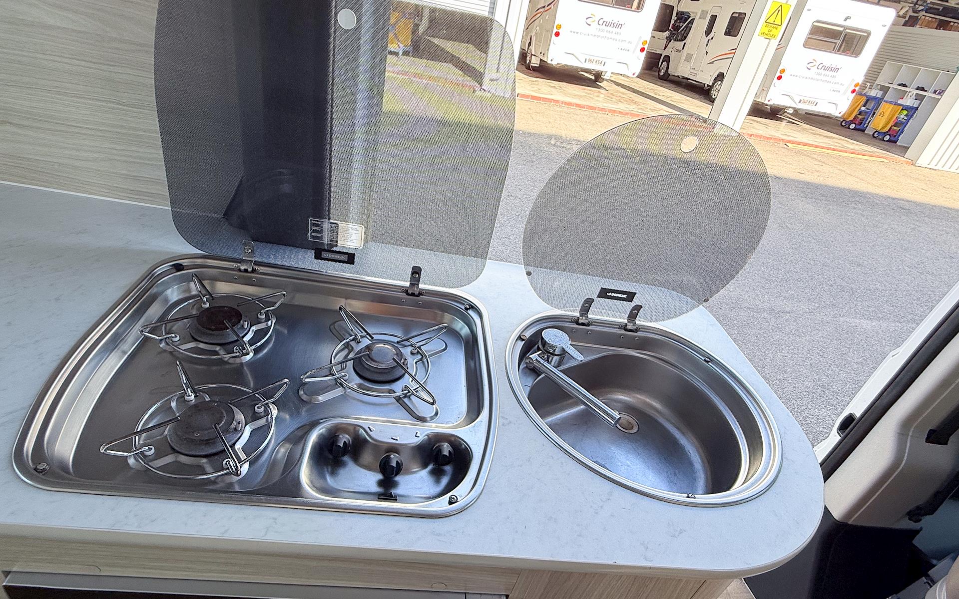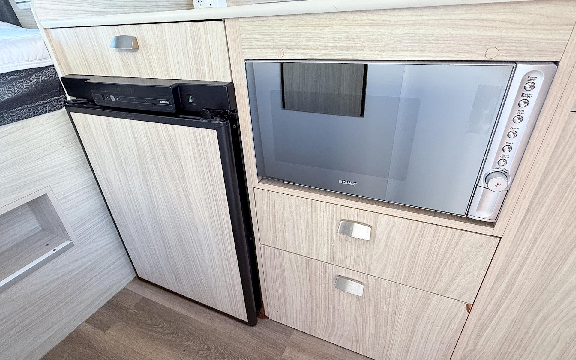 • Fully equipped kitchen: 95L 3-way fridge/freezer, Microwave, 2 or 3-burner gas stove