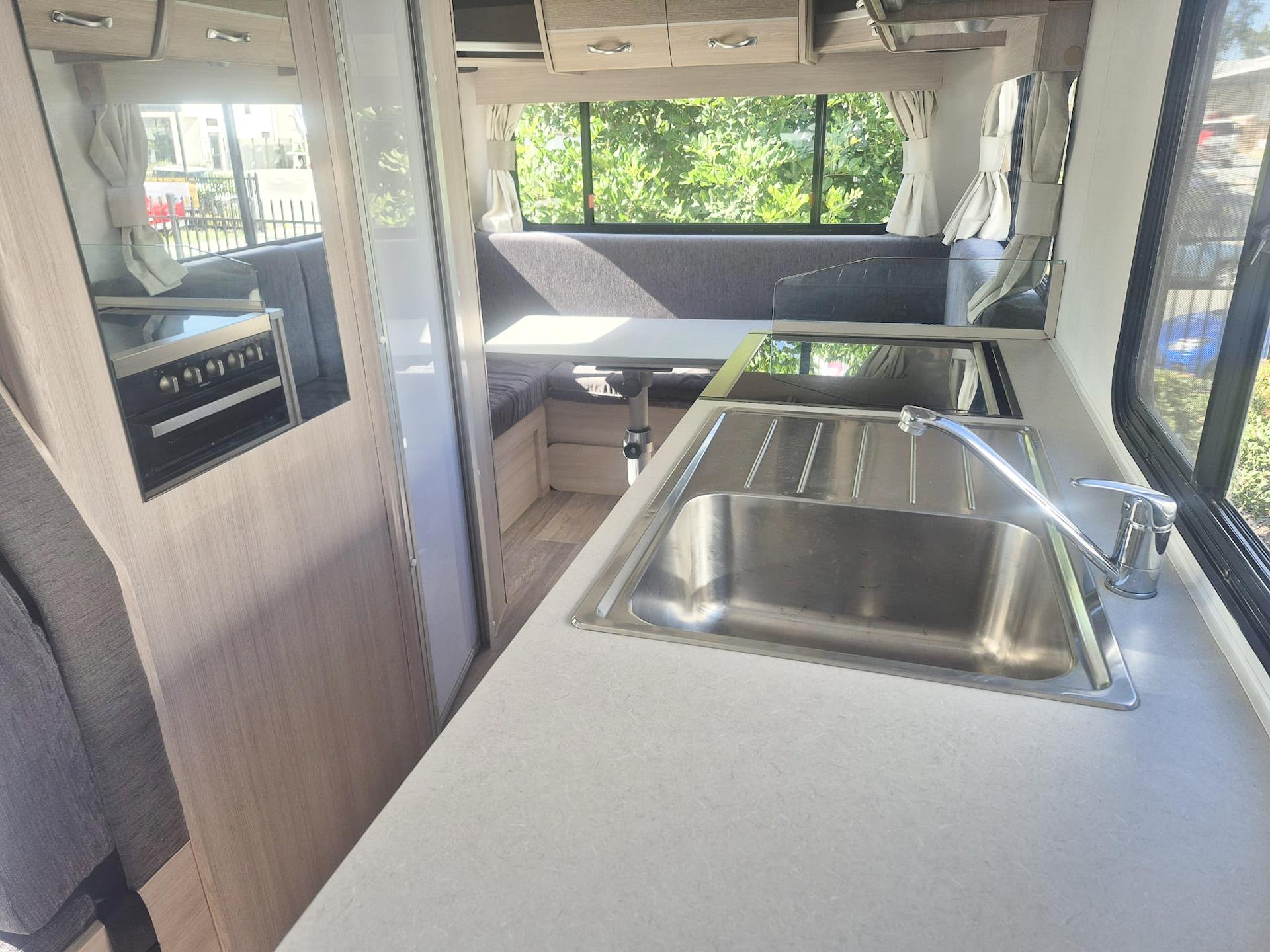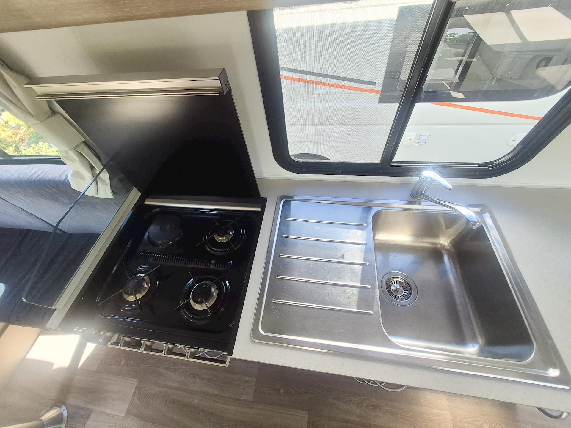• Fully equipped kitchen: 190L 3-way fridge/freezer, Microwave, 3-burner gas stove + 1x electric cooktop