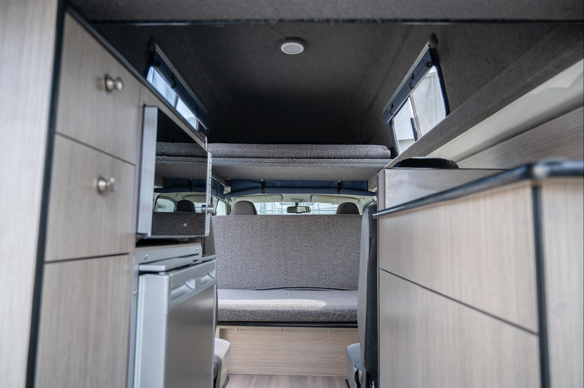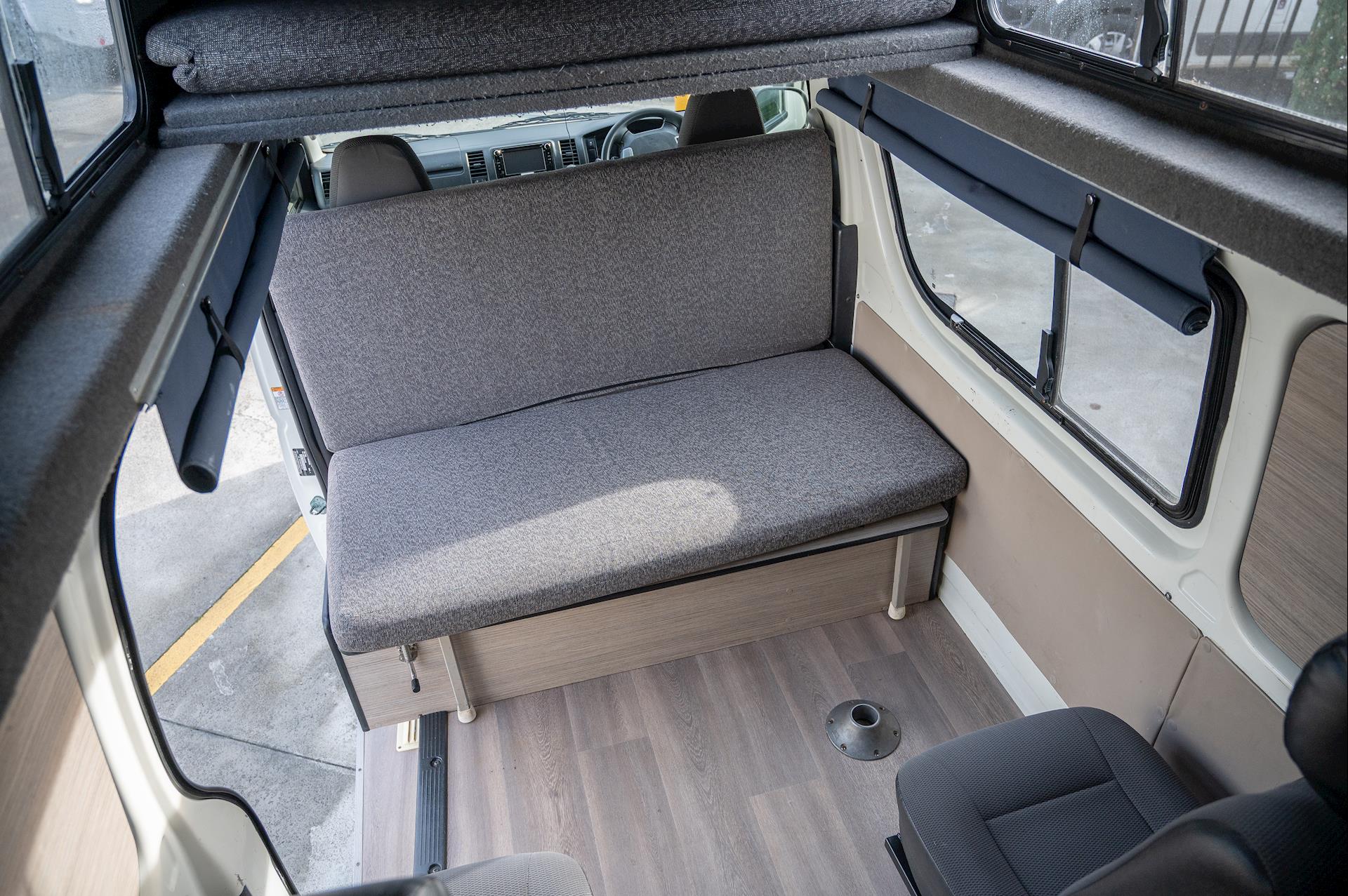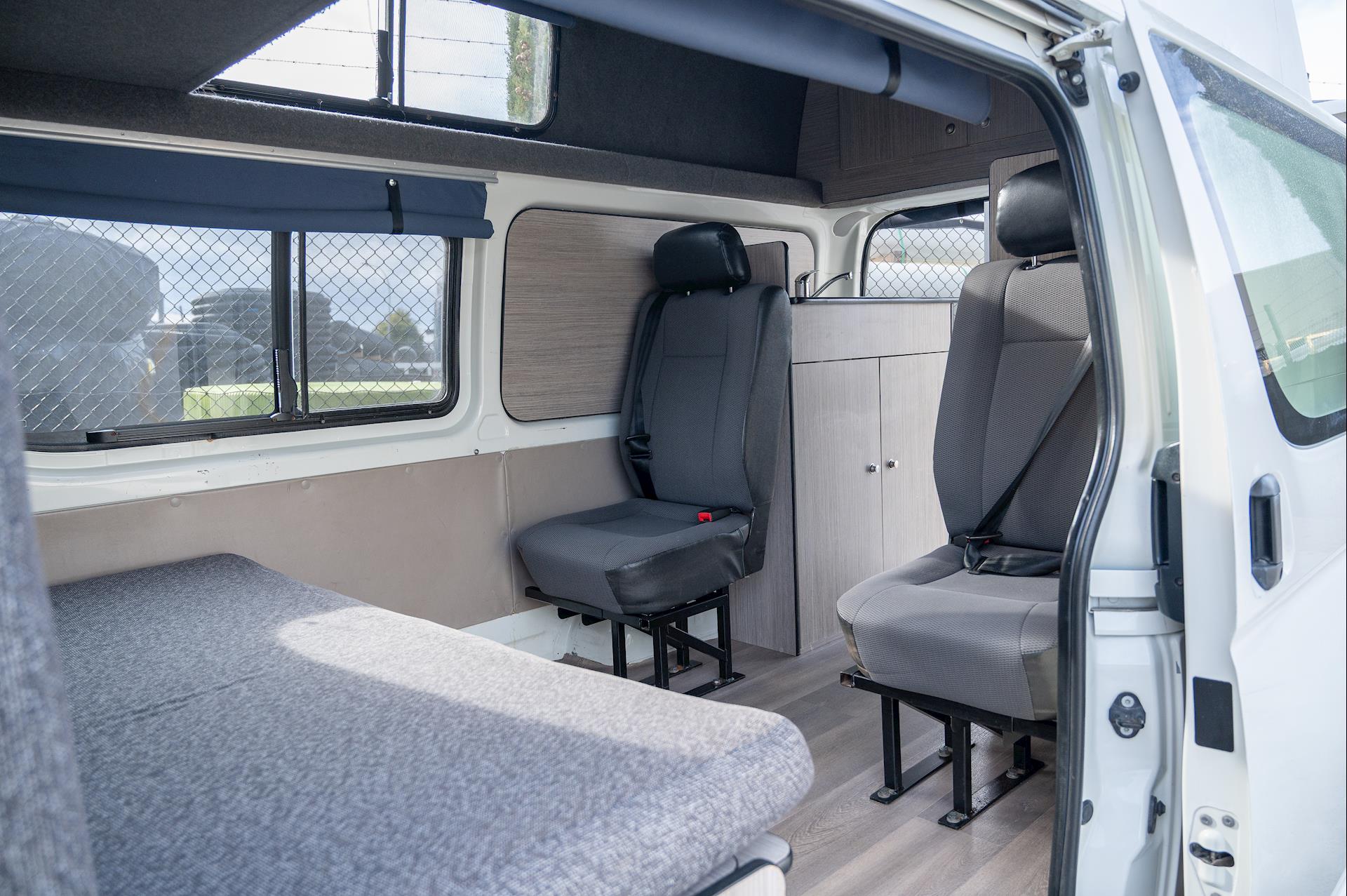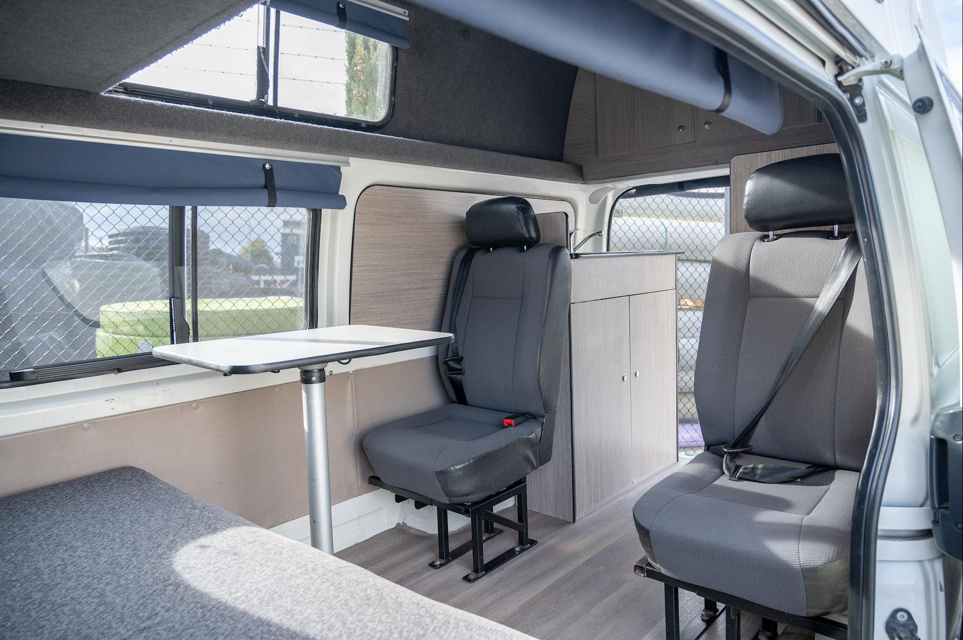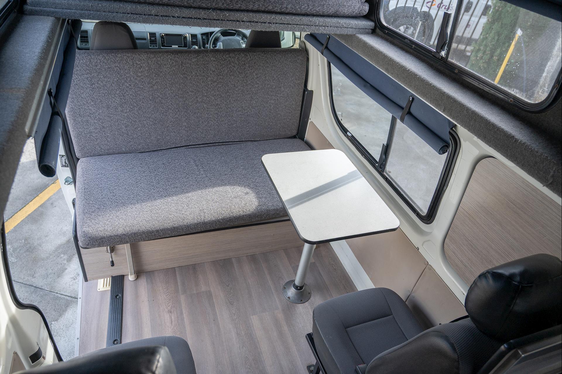 Introducing a 4-berth Toyota Hiace Campervan, equipped with a full kitchen, microwave, fridge, built-in tables, and space for four people.