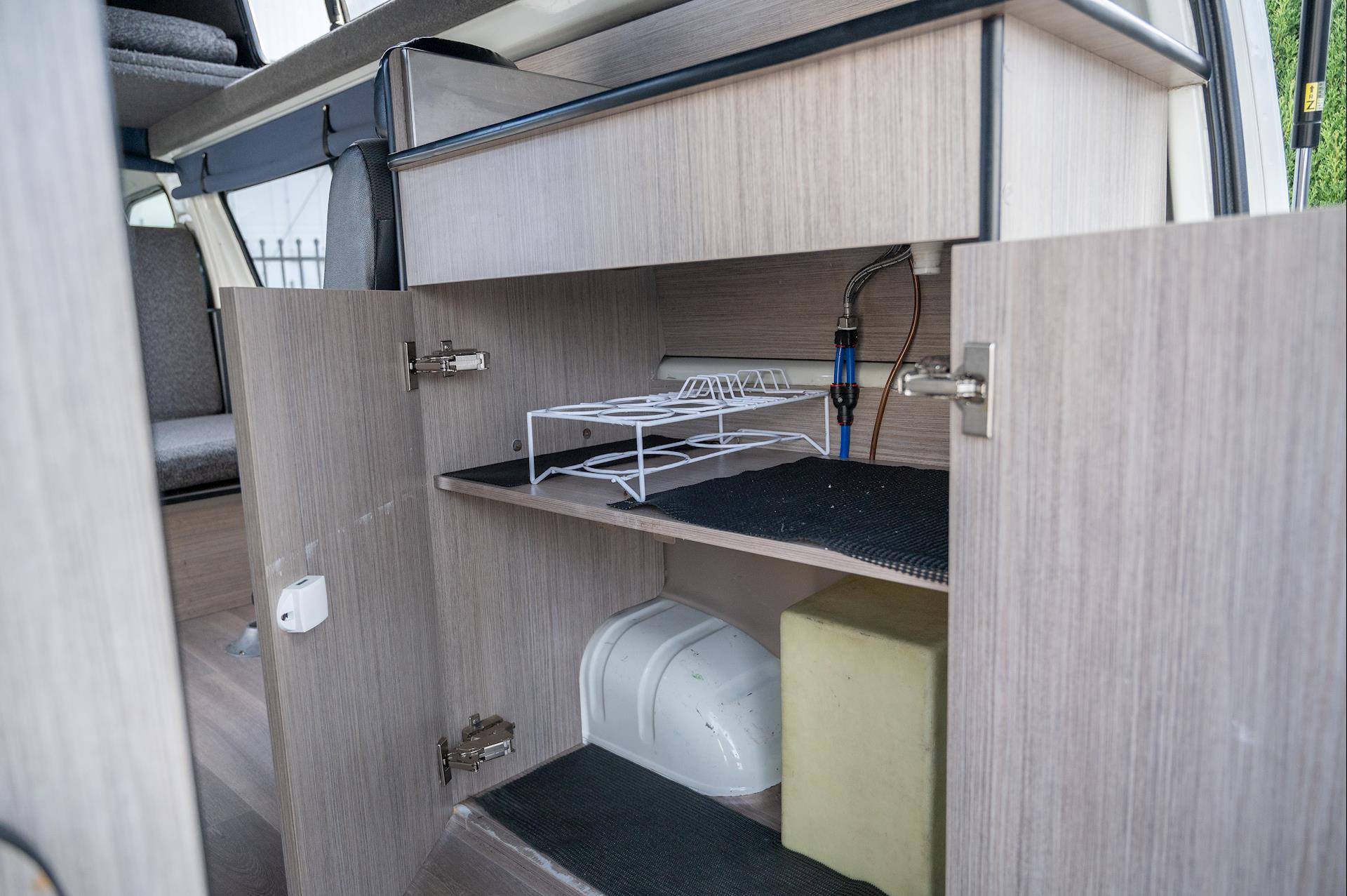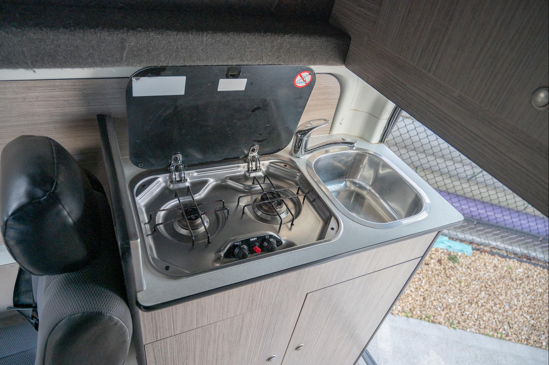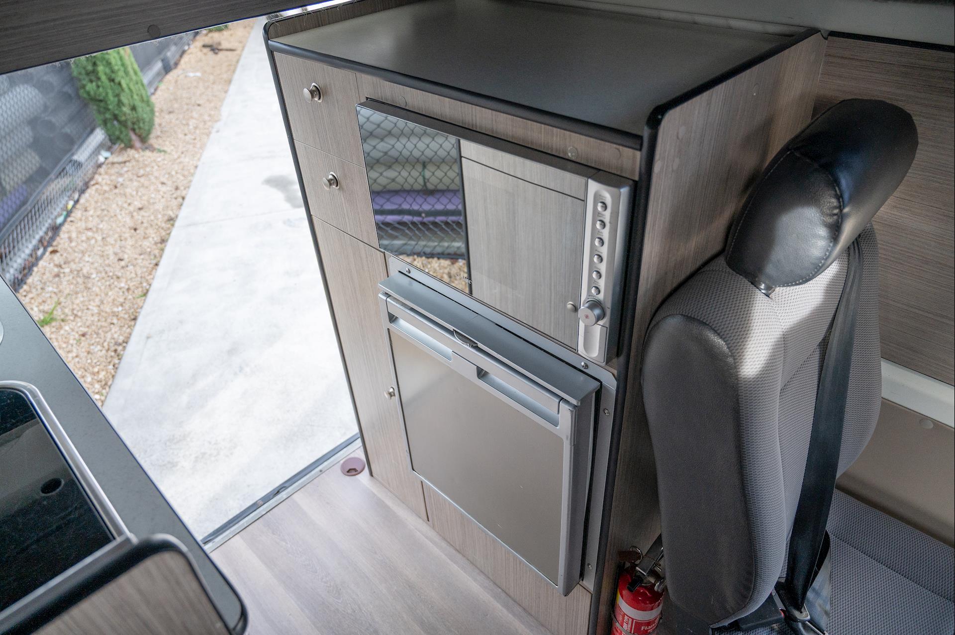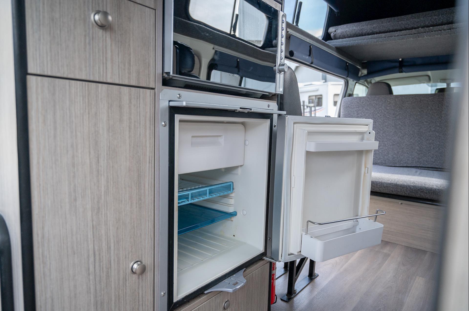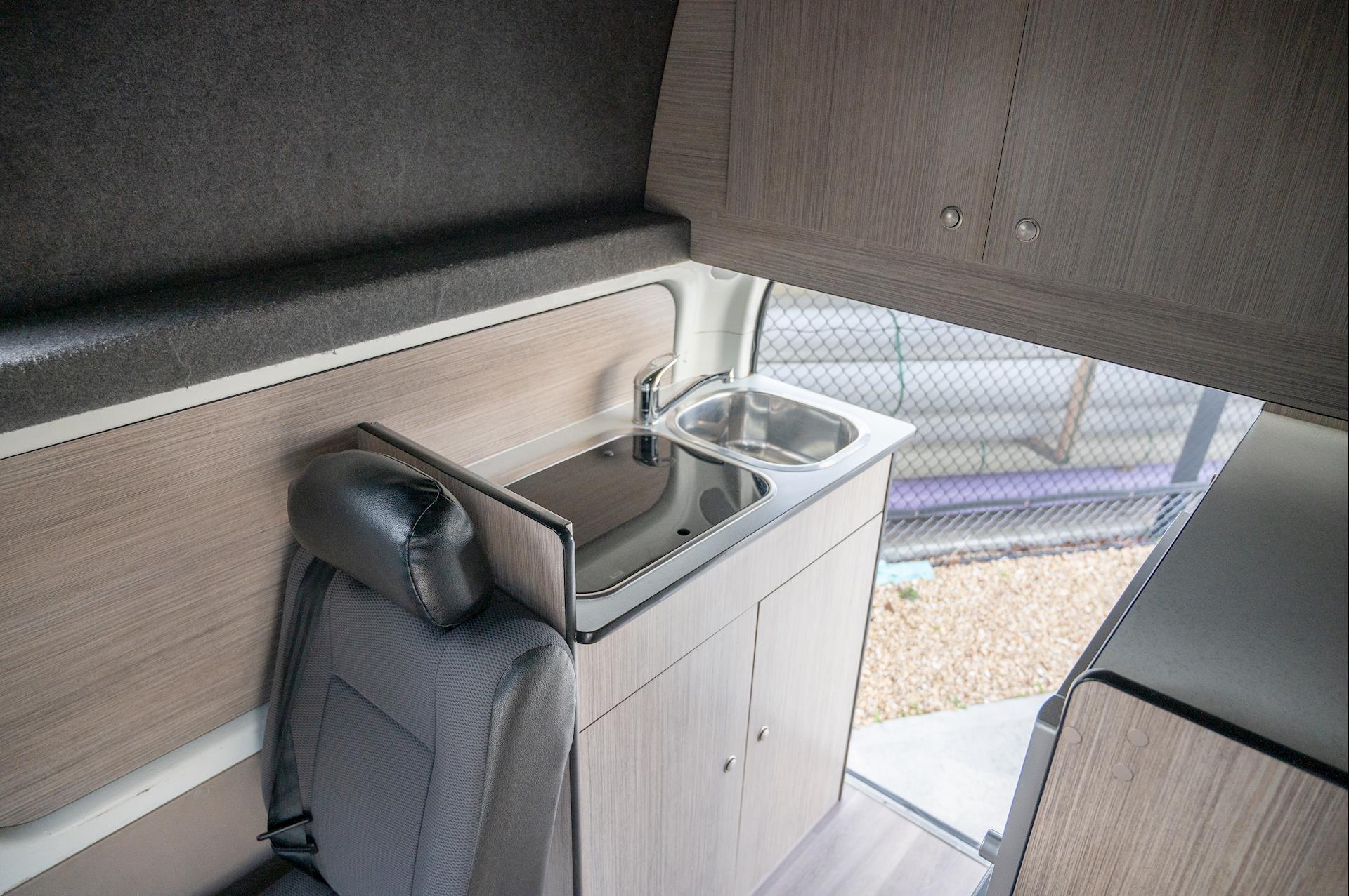 Introducing a 4-berth Toyota Hiace Campervan, equipped with a full kitchen, microwave, fridge, built-in tables, and space for four people.