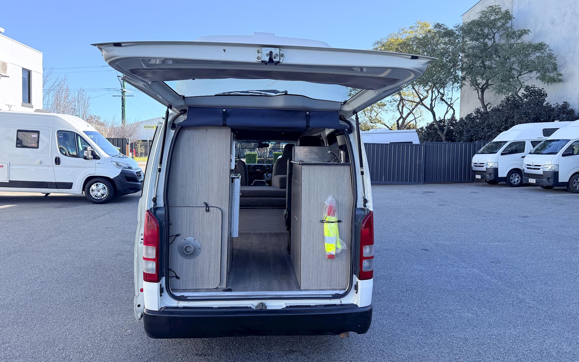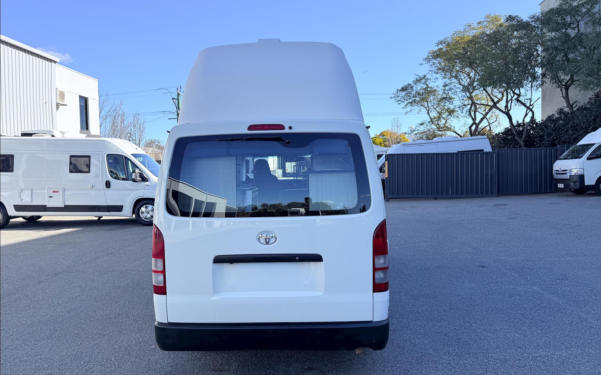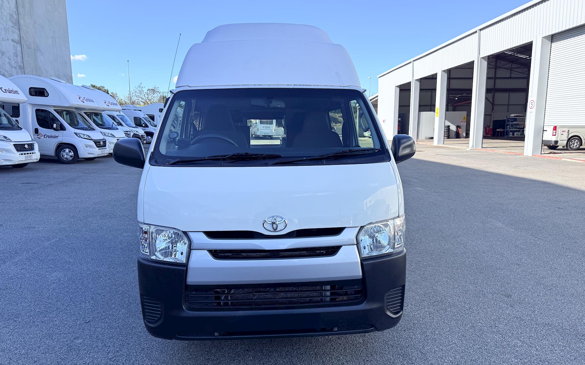 Introducing a 4-berth Toyota Hiace Campervan, equipped with a full kitchen, microwave, fridge, built-in tables, and space for four people.