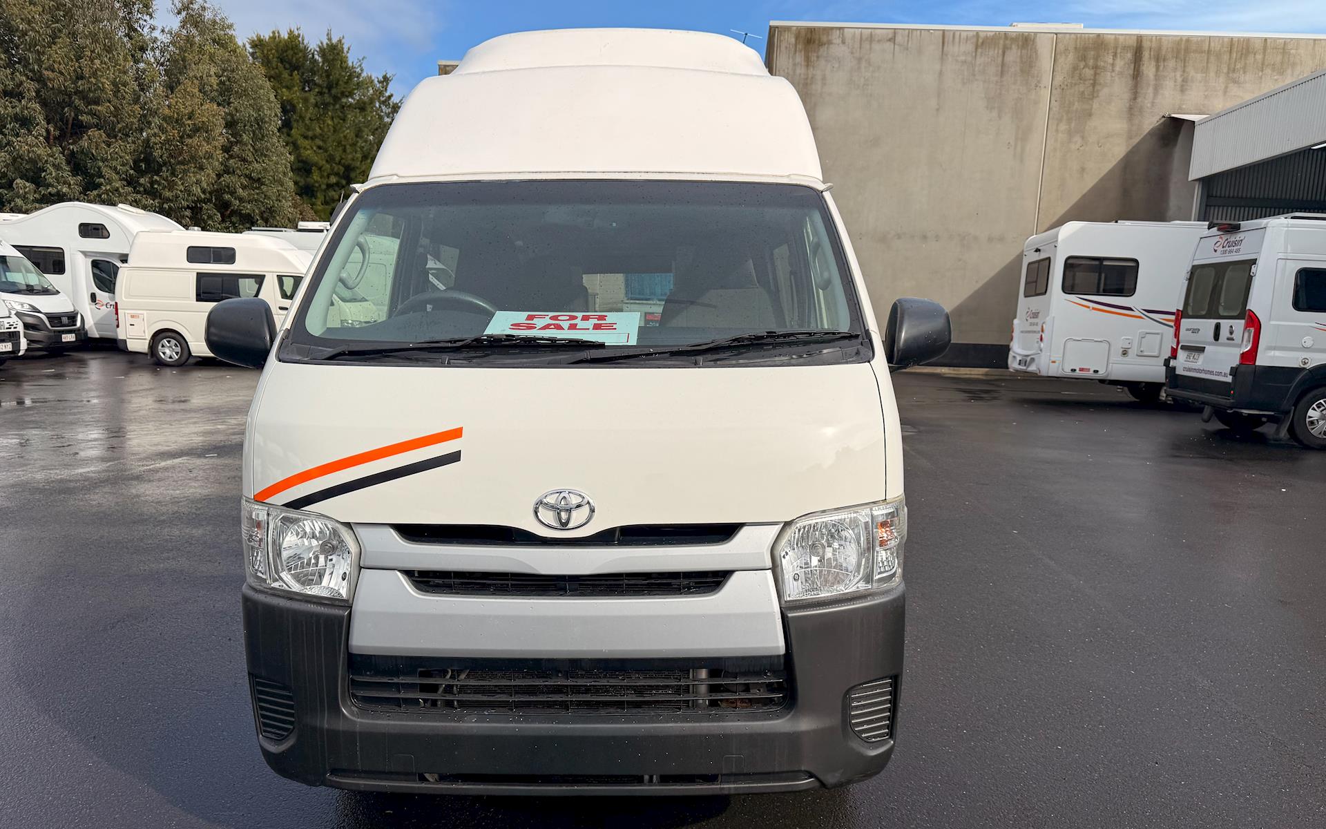 Introducing a 4-berth Toyota Hiace Campervan, equipped with a full kitchen, microwave, fridge, built-in tables, and space for four people.